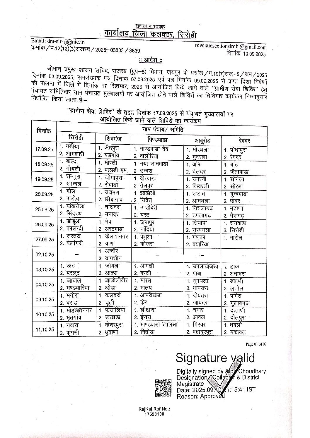 ग्रामीण सेवा शिविर 17 सितम्बर से, गांव-गांव पहुंचेगी सरकारी सेवाएं पिण्डवाडा प्रदेशभर में "गांव चलो अभियान" अब "ग्रामीण सेवा शिविर" के रूप में 17 सितम्बर से शुरू होगा। पहले चरण…