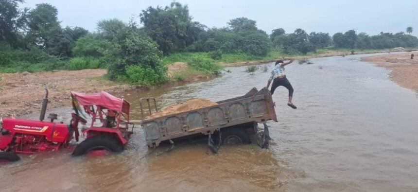 पिंडवाड़ा: झाडोली नदी में अवैध बजरी से भरा ट्रैक्टर फंसा