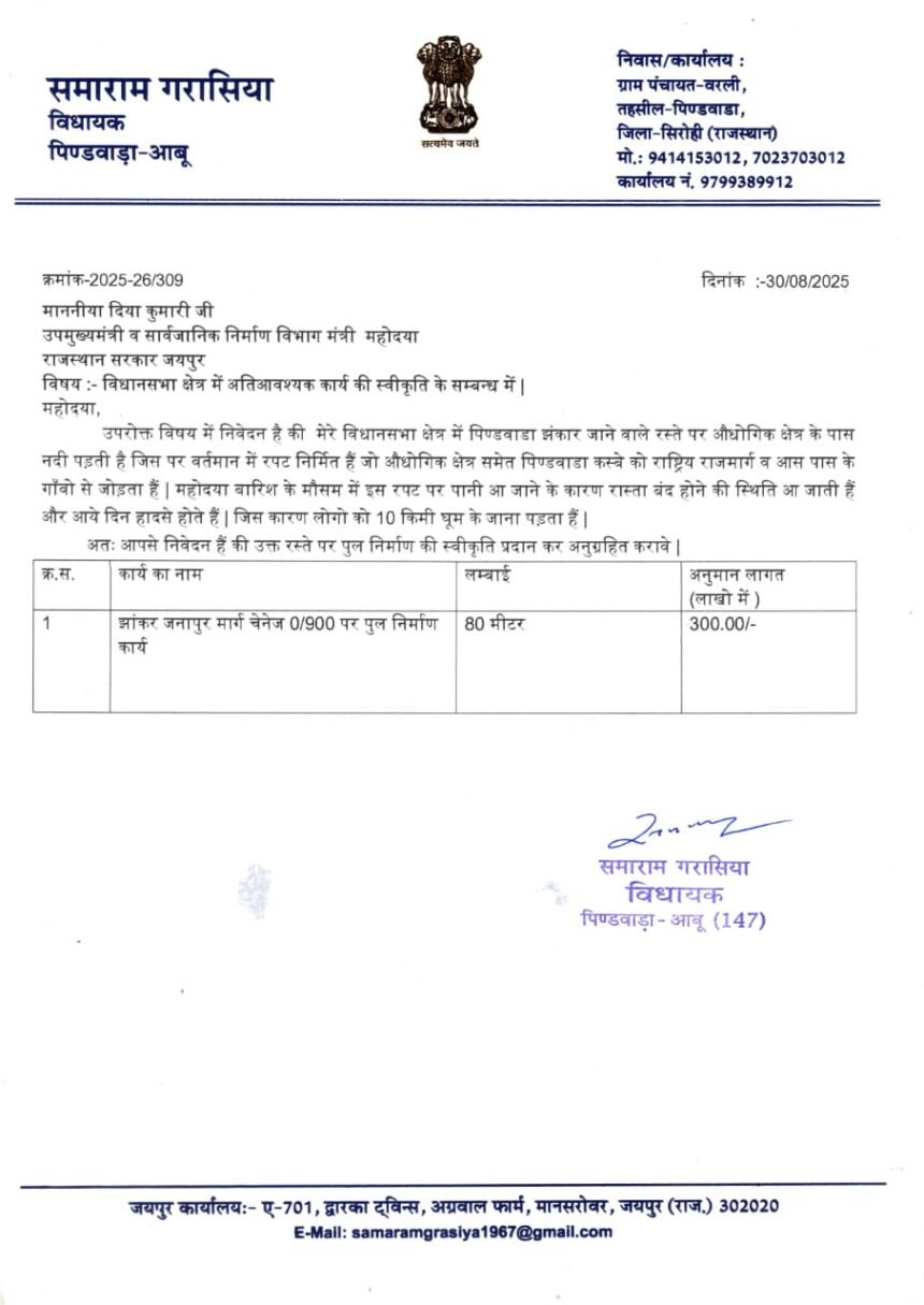 झांकर-जनापुर मार्ग पर पुल निर्माण की स्वीकृति, पिण्डवाड़ा क्षेत्र को बड़ी सौगात